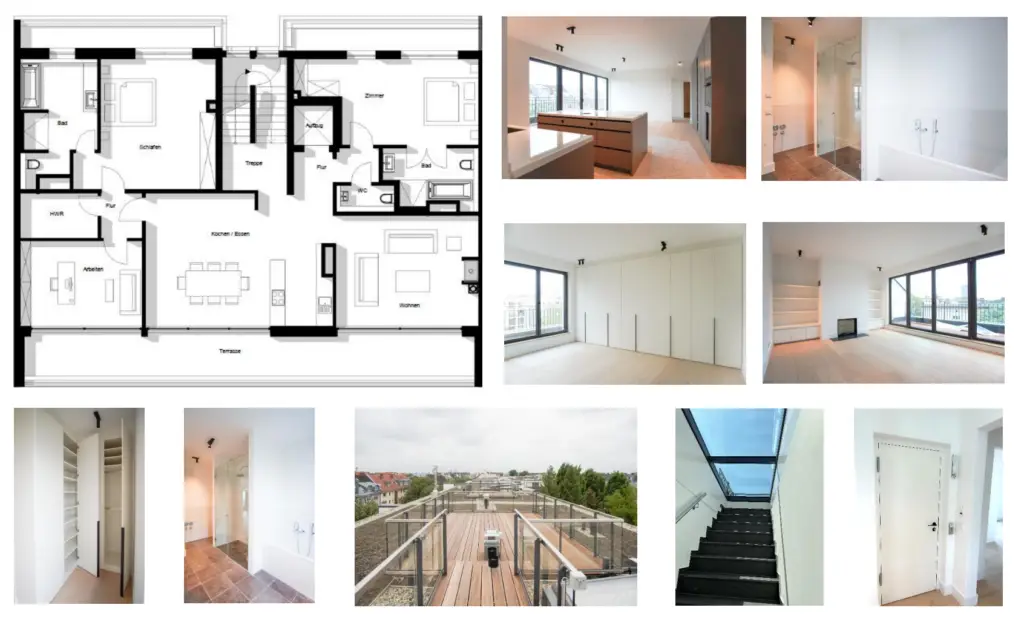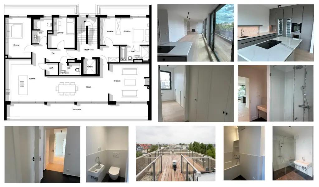 ETW – Nr. 30 im Dachgeschoss, 5 Zimmer mit einer Wohnfläche von ca. 196,17 m², 1 Dachterrasse, 1 Süd-Terrasse, hochwertige maßgefertigte Einbauküche,1 Ankleidebereich mit maßgefertigten Einbauschränken, 1 Dusch- und Wannenbad, 1 Duschbad, 1 Gäste-WC, 1 HW-Raum, etc.